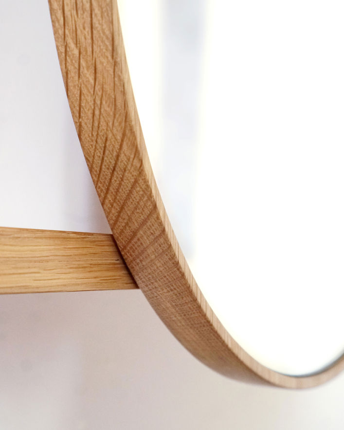 Một thiết kế lạ mắt, kết hợp giữa tính thẩm mỹ và công năng. Gương tròn được lắp đặt trên ray trượt gỗ âm, cho phép bạn dễ dàng kéo gương sang trái hoặc phải — linh hoạt theo vị trí sử dụng hoặc chỉ đơn giản là để tạo điểm nhấn mới cho không gian sống.